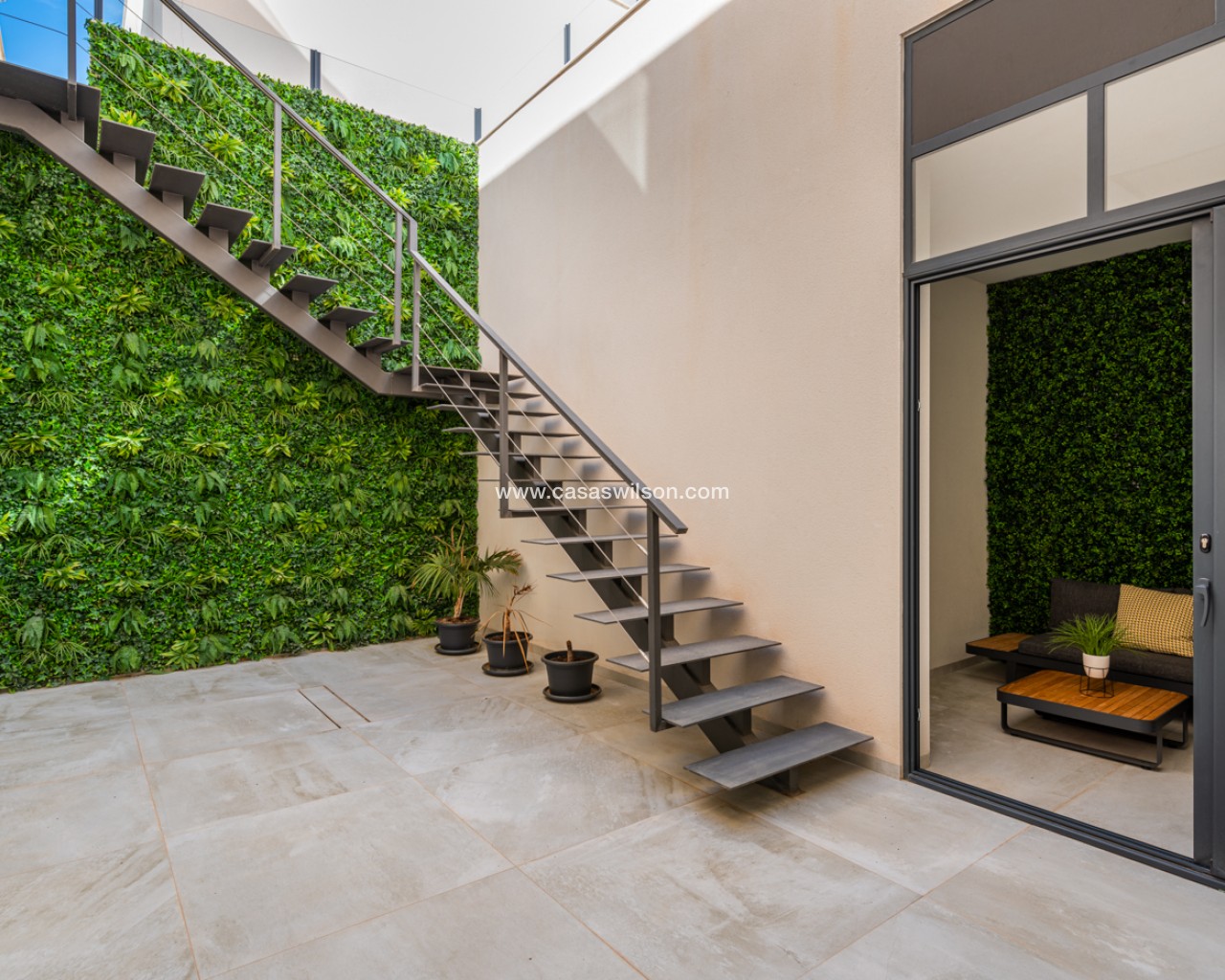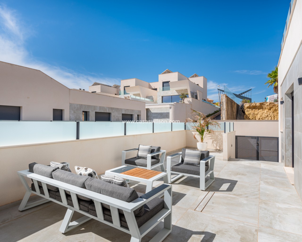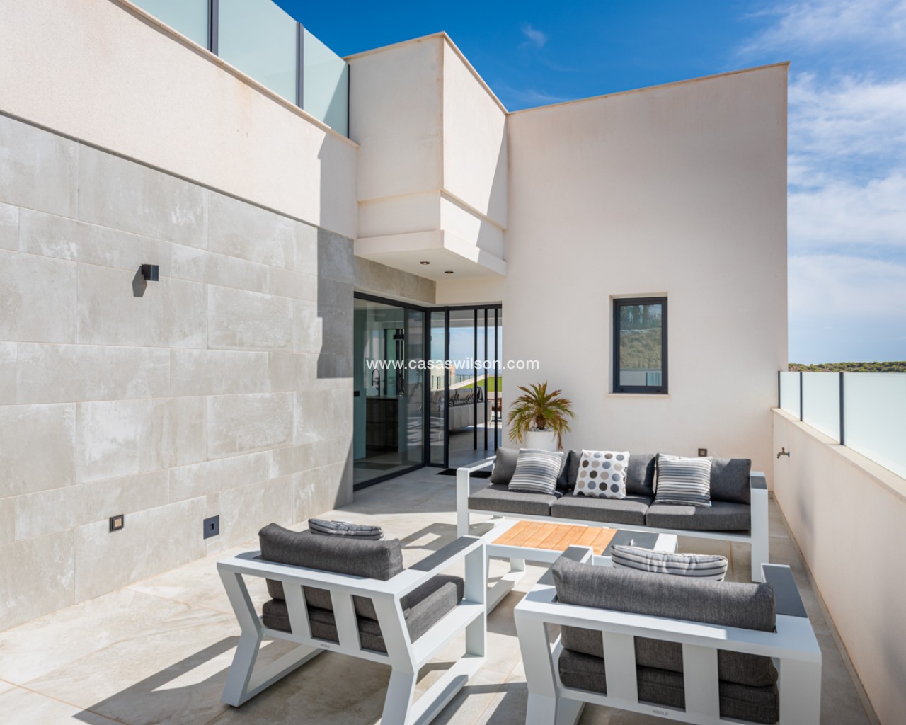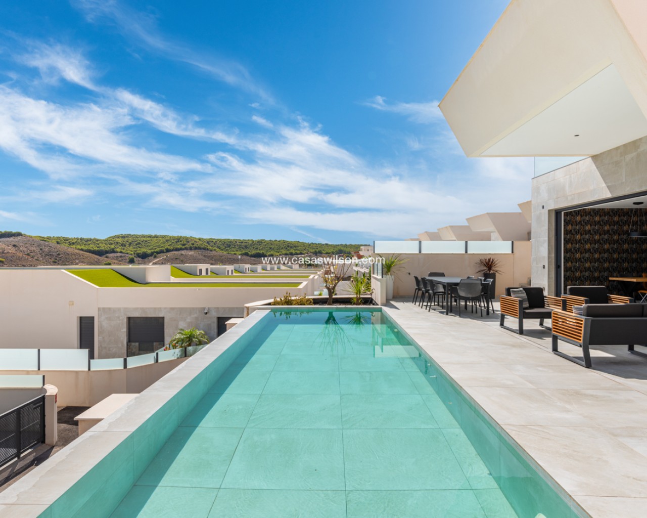 Luxury 5 bedroom / 6 bathroom villa with views in Ciudad Quesada. Beautiful luxury villa with a total living area of 333 m2 divided on two levels. It consists of a total of 5 double bedrooms, all of them with en-suite bathrooms, an additional bathroom and a guest toilet. The main floor consists of two bedrooms with en-suite bathrooms, a guest toilet, and a lovely open plan kitchen, living room and dining room. In the living area you have large sliding doors that opens up completely and gives a great indoor / outdoor living feature. The lower level consists of three bedrooms with en-suite bathrooms, a kitchen and utility room, a large living room, a bathroom, two storage rooms. The rooms in this level have access to a lovely patio. From the living room on this level you have direct access to the garage and techical room. The villa is equipped with central air condition (hot/cold), underfloor heating in the bathrooms, double glazes windows and security door. Outdoor areaThe villa is set on a lovely corner plot of 462 m2. The pool area is east facing, giving you amazing views over the surrounding area and to the sea. Around the pool you have a beautiful tiled area with space for several outdoor seating areas and sun beds. From the pool area you have external stairs leading you to the large roof terrace. Here you have one part that is tiled and the other part with artificial grass, both of them with a lot of space for outdoor entertainment and with amazing views. At the entrance to the house you have another lovely tiled garden area that faces west. This area is perfect to enjoy the afternoon / evening sun. At the lower level you can find a large tiled patio with an artificial vertical garden. This patio can be access from the garden through external stairs, and also from the living room and 2 of the bedrooms in the lower level.