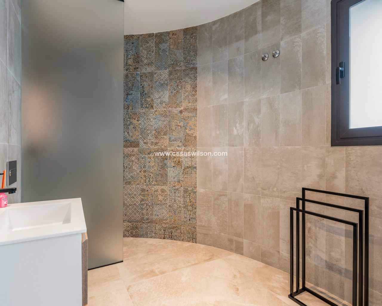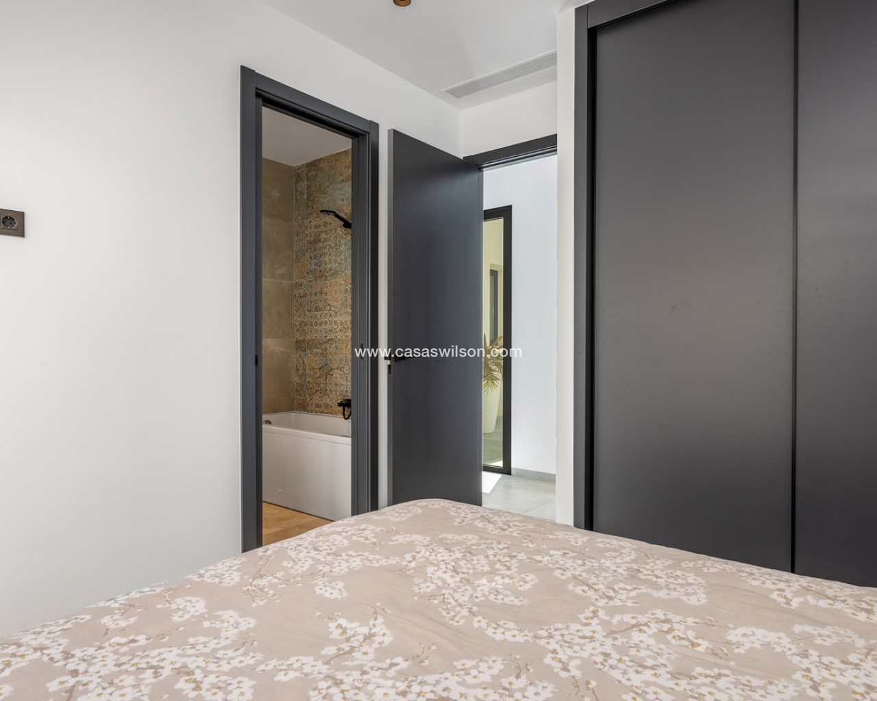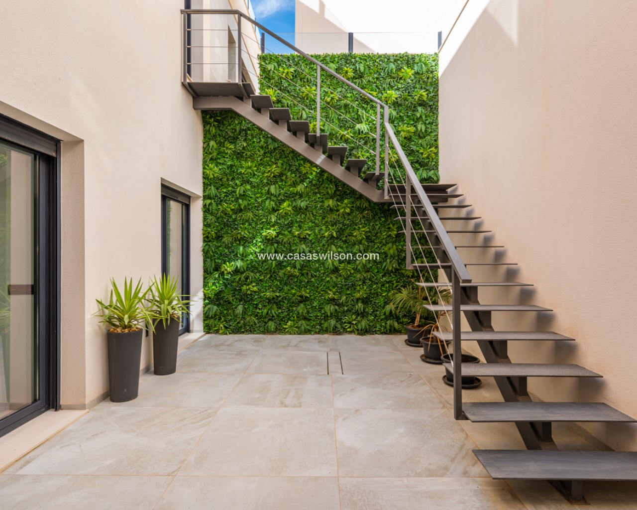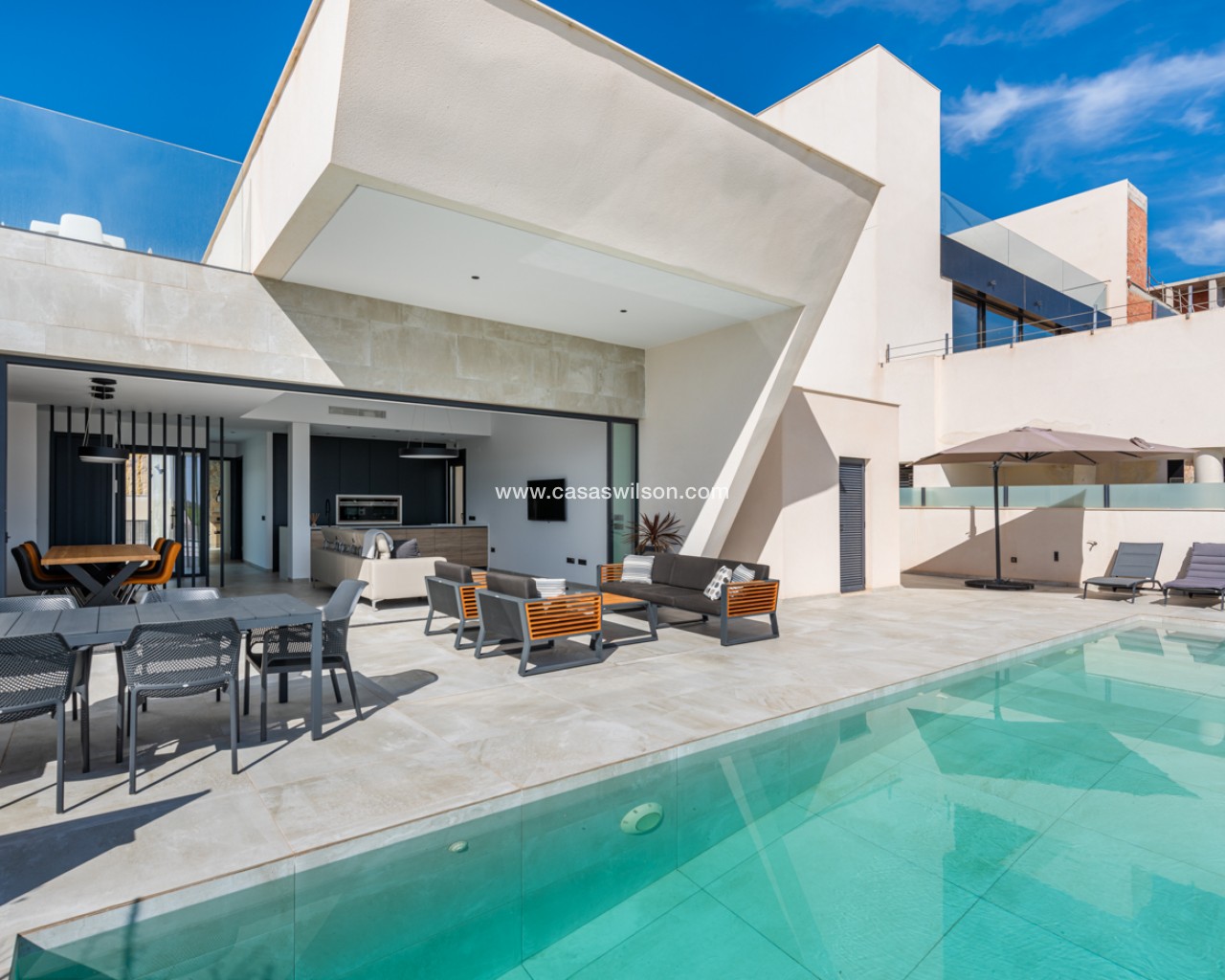 Luxury 5 bedroom / 6 bathroom villa with views in Ciudad Quesada. Beautiful luxury villa with a total living area of 333 m2 divided on two levels. It consists of a total of 5 double bedrooms, all of them with en-suite bathrooms, an additional bathroom and a guest toilet. The main floor consists of two bedrooms with en-suite bathrooms, a guest toilet, and a lovely open plan kitchen, living room and dining room. In the living area you have large sliding doors that opens up completely and gives a great indoor / outdoor living feature. The lower level consists of three bedrooms with en-suite bathrooms, a kitchen and utility room, a large living room, a bathroom, two storage rooms. The rooms in this level have access to a lovely patio. From the living room on this level you have direct access to the garage and techical room. The villa is equipped with central air condition (hot/cold), underfloor heating in the bathrooms, double glazes windows and security door. Outdoor areaThe villa is set on a lovely corner plot of 462 m2. The pool area is east facing, giving you amazing views over the surrounding area and to the sea. Around the pool you have a beautiful tiled area with space for several outdoor seating areas and sun beds. From the pool area you have external stairs leading you to the large roof terrace. Here you have one part that is tiled and the other part with artificial grass, both of them with a lot of space for outdoor entertainment and with amazing views. At the entrance to the house you have another lovely tiled garden area that faces west. This area is perfect to enjoy the afternoon / evening sun. At the lower level you can find a large tiled patio with an artificial vertical garden. This patio can be access from the garden through external stairs, and also from the living room and 2 of the bedrooms in the lower level.