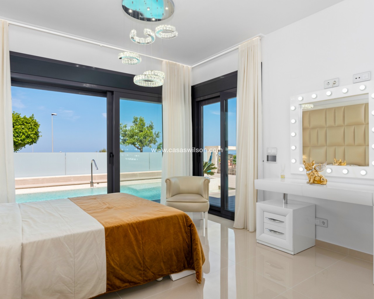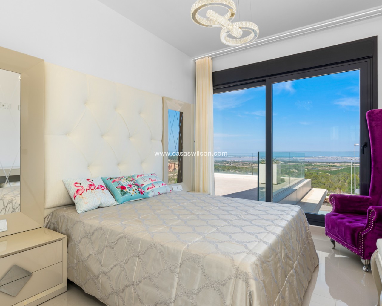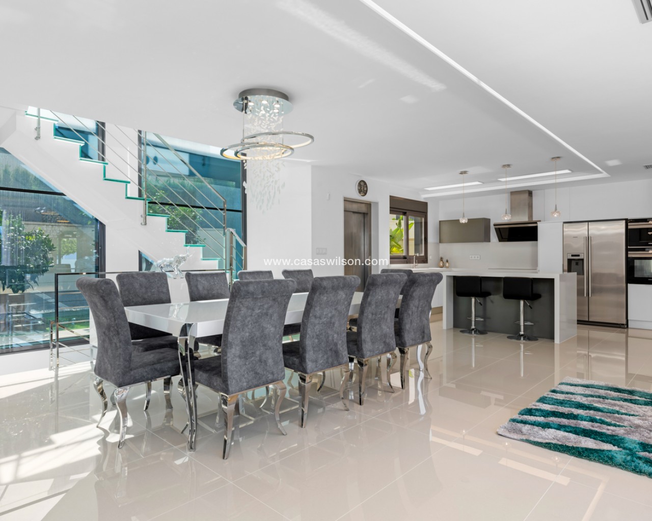 Luxury villa with 5 bedrooms and incredible views This recently built luxury property has a total of 5 bedrooms and 4 bathrooms, distributed over two floors and a basement, with a practical elevator that communicates with all the floors of the house and a beautiful glass staircase with interior lighting. In the basement we find a game room (with billiards and table football), a room for celebrations with a full kitchen, 2 bedrooms, 2 storage rooms and a full bathroom. On the main floor we find the living-dining room with an open-concept kitchen and central island, the main bedroom with an en-suite bathroom, as well as a laundry room and a toilet. On the first floor there are 2 spacious bedrooms, 2 bathrooms and access to the balconies. On the top floor we find an incredible 70m2 solarium with impressive panoramic views. EquipmentIt has air conditioning, its own parking for several vehicles, central heating with underfloor heating throughout the house and is for sale furnished with designer furniture and totally equipped, except for personal belongings. The house also has a pellet machine to heat the house, as well as solar panels and an electric water heater. The house includes security windows and doors, with keyed keys, as well as a security system with sensors in all rooms. The equipment is of high quality, including: motorized sofas, brand new mattresses, steam oven with pyrolysis, combo fridge that makes normal and crushed ice. Outdoor spaceIn the garden we find a private pool with waterfall, jacuzzi and hydromassage. The space around the pool is well cared for, decorated with a large amount of vegetation. Next to the pool we find an outdoor shower. Finally, there is also parking for several cars within the plot. AreaResidencial Bellavista is located in one of the areas with the best views of the Costa Blanca. In the municipality of San Miguel de Salinas, just 7 kilometers from the beaches of Orihuela, surrounded by golf courses, the most important shopping center in the area that has all kinds of services, as well as bars, restaurants, shops clothes, supermarkets, etc. This residential is ideal for lovers of nature and tranquility.